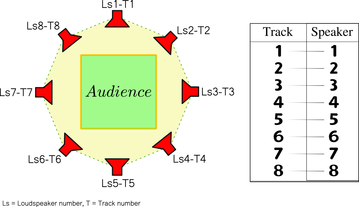 For the performance of this piece, any arrangement of the eight loudspeakers is acceptable, as long as the loudspeakers are evenly spaced from each other and surround the audience (e.g., an arrangement of eight loudspeakers in a straight row would not be permissible). Here is one (classical) possibility, but other surround arrangements are also conceivable: